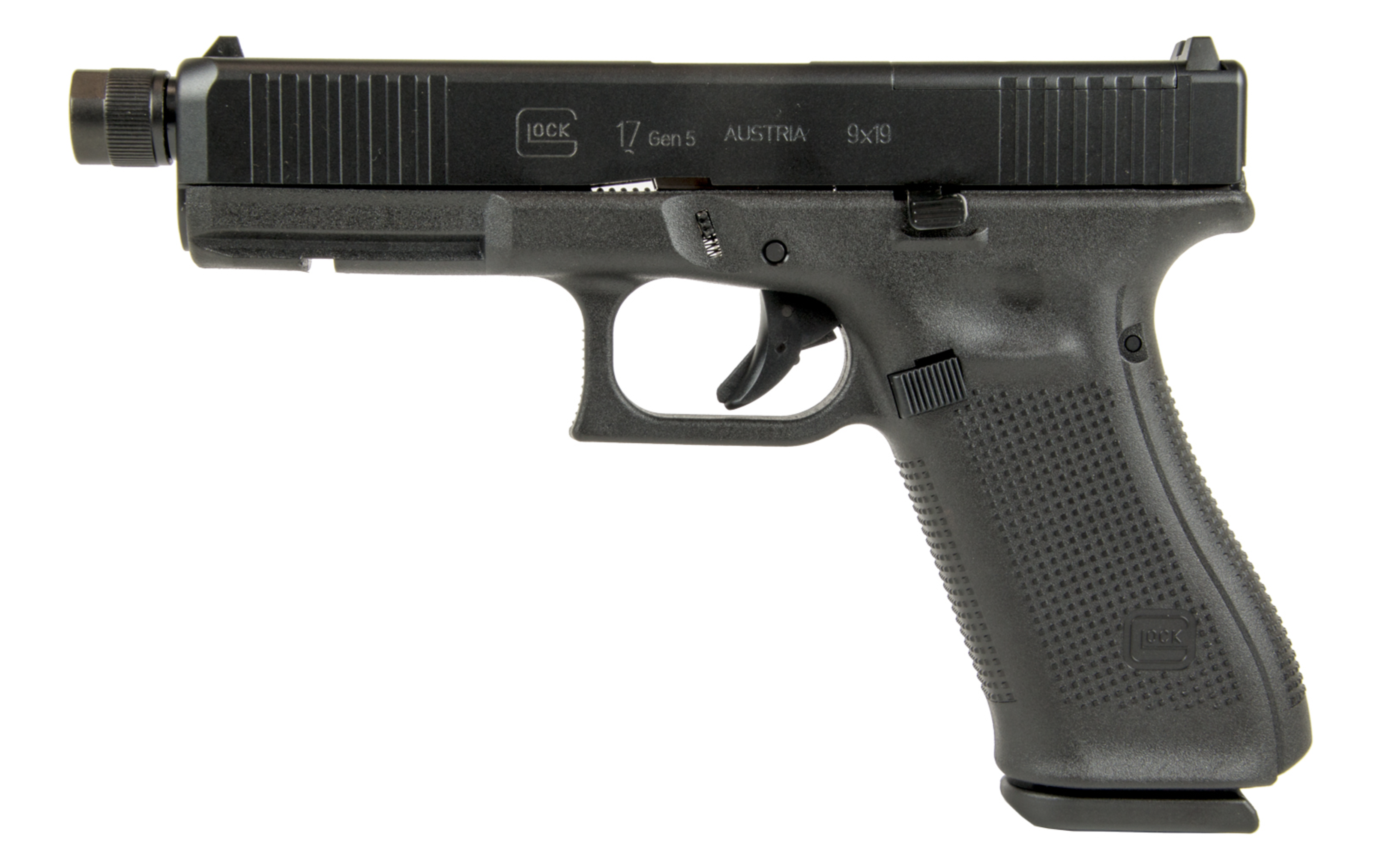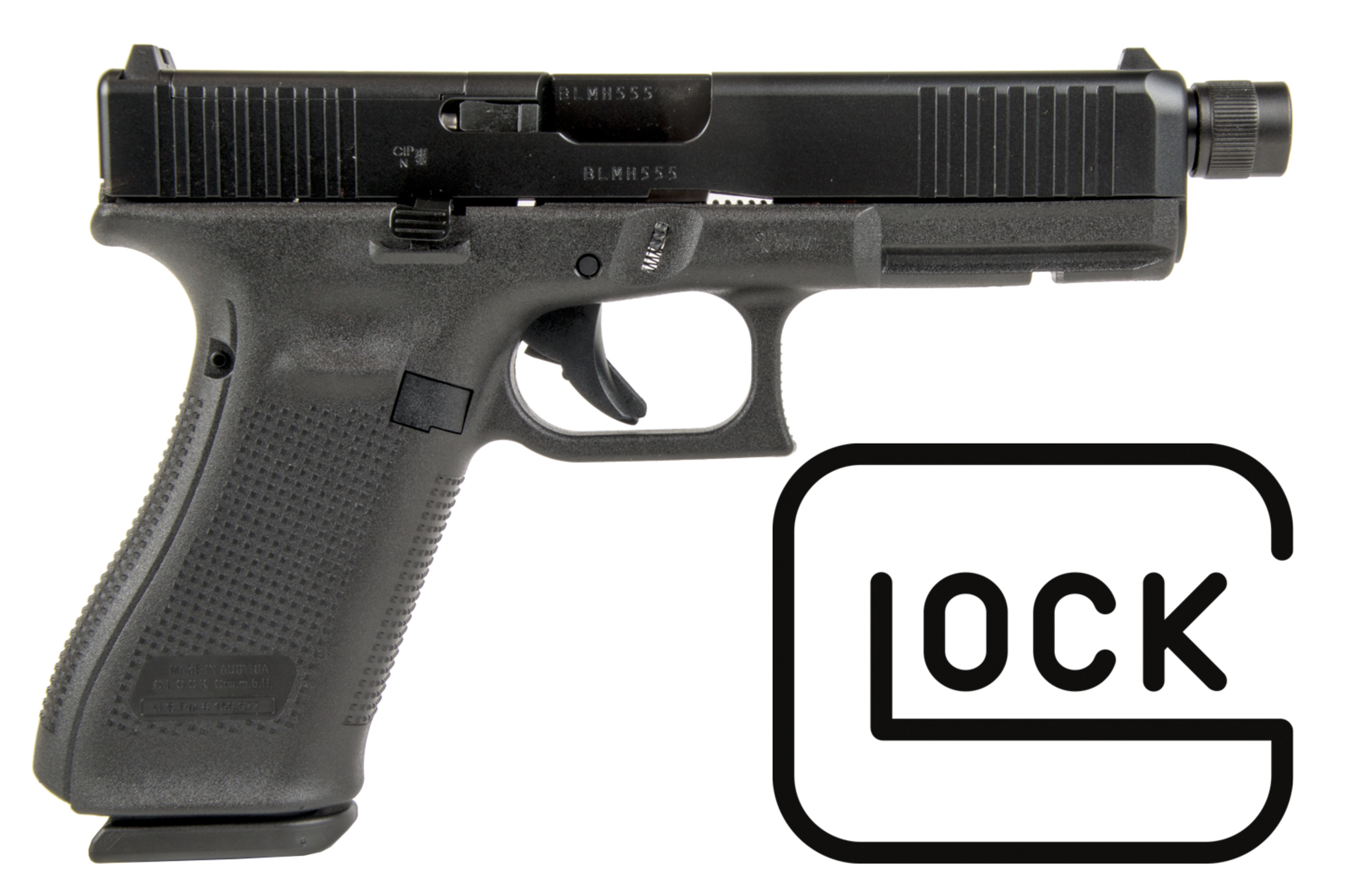 This model features a threaded (M13.5x1) barrel and includes Glock's Modular Optics System (or MOS) adaptor set.